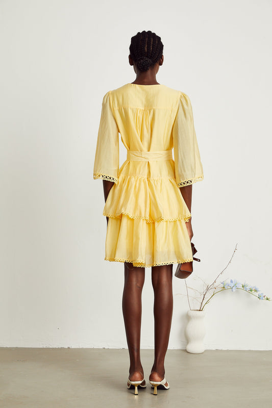 31% İndirimKarine Sarı Dantel Kenarlı Kat Kat Mini Elbise