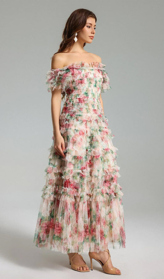 24% İndirimKapalı Omuz Çiçekli Fırfırlı Örgü Maksi Elbise