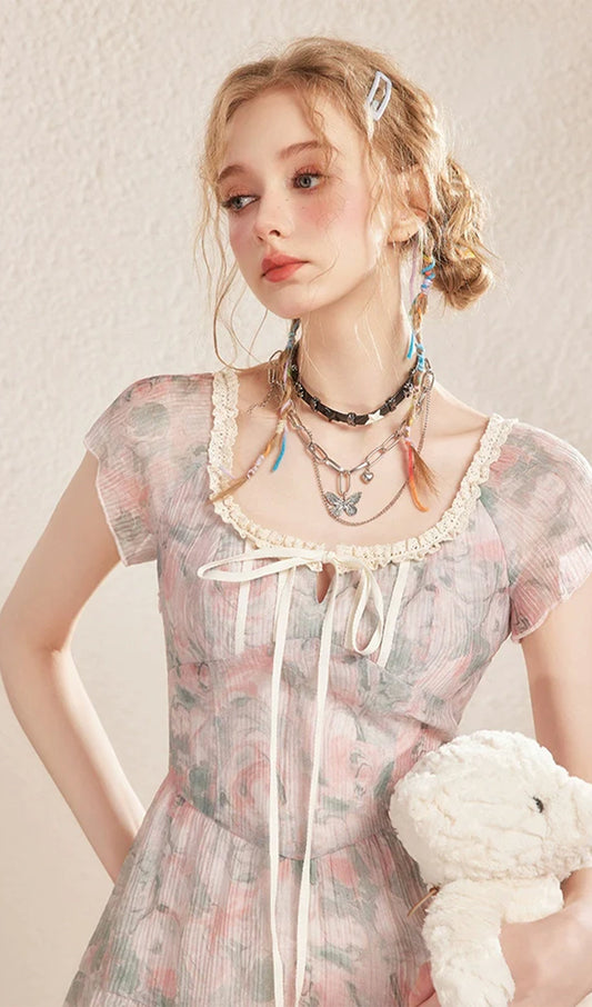 Pembe Çiçekli U Yaka Dantel Süslemeli Mini Elbise