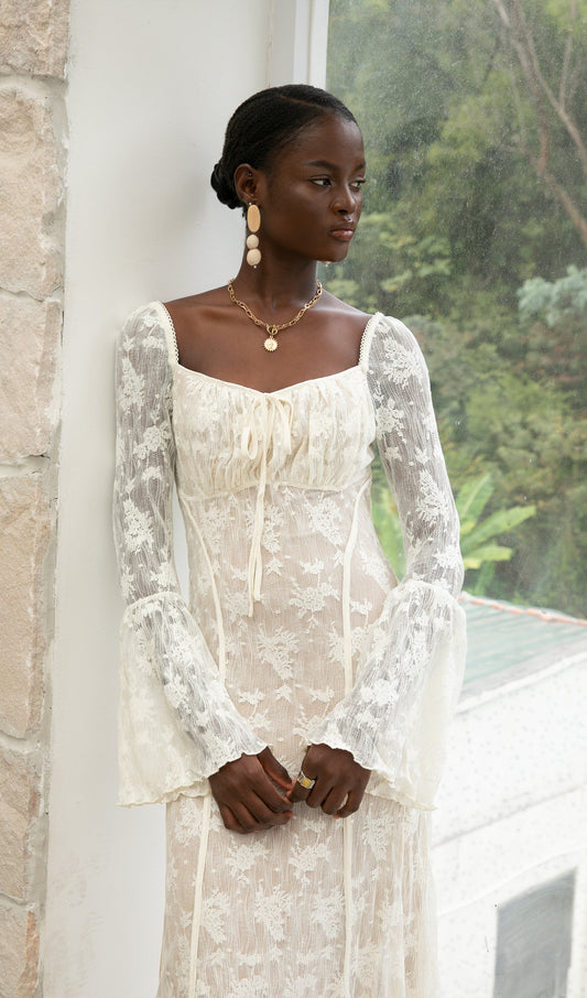 30% İndirimTrendy Vintage Krem Dantel Maksi Elbise