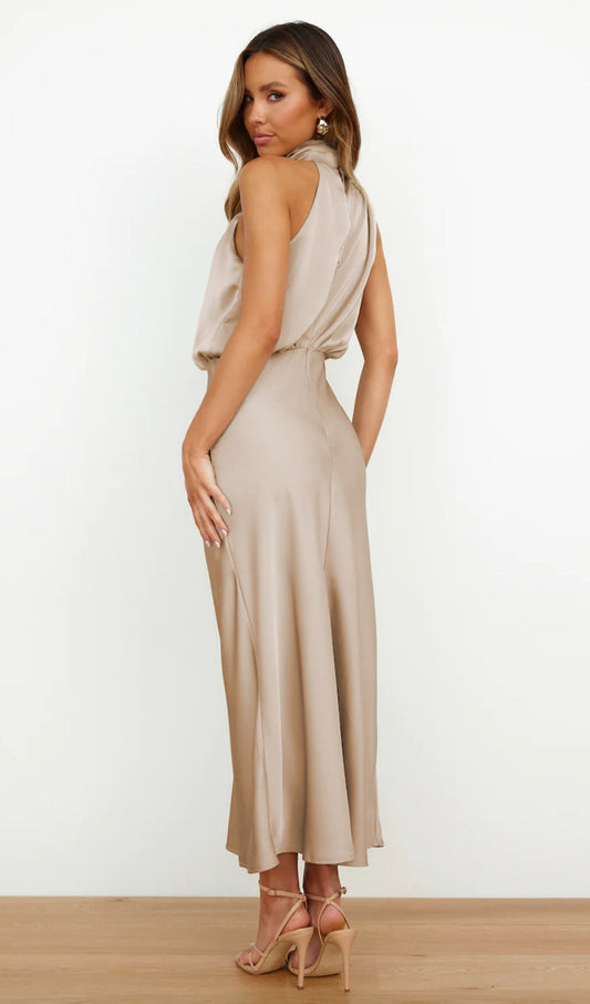 32% İndirimAryndriel Kolsuz Büzgülü Yaka Saten Midi Elbise