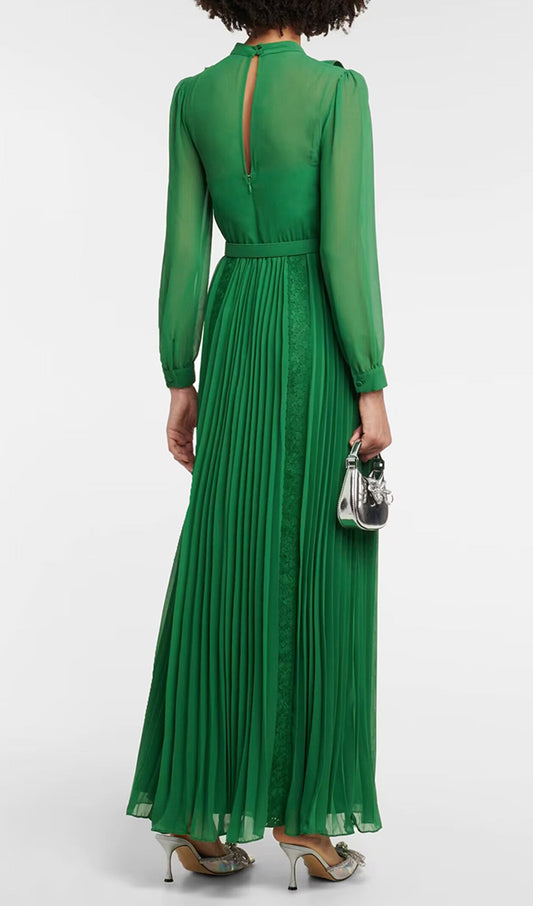 Fit ve Flare Maksi Fırfırlı Pileli Dantel Elbise Yeşil