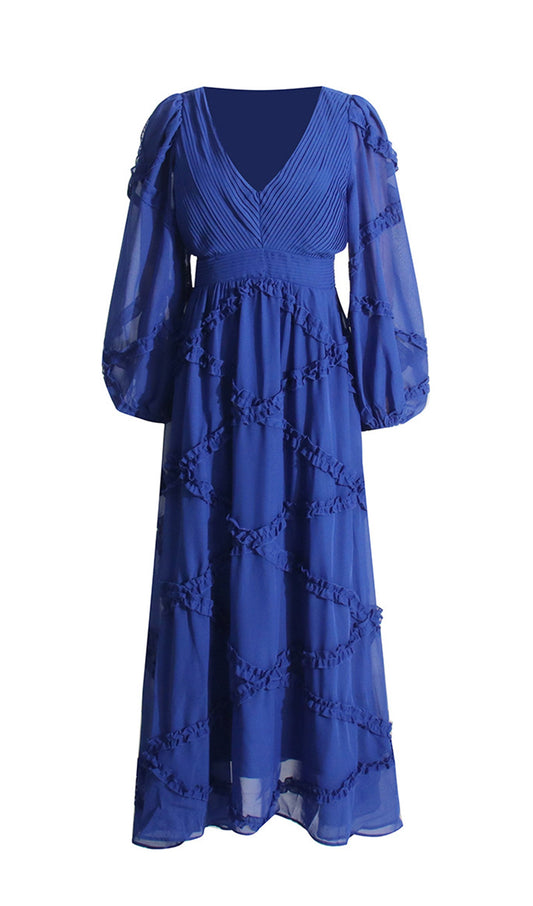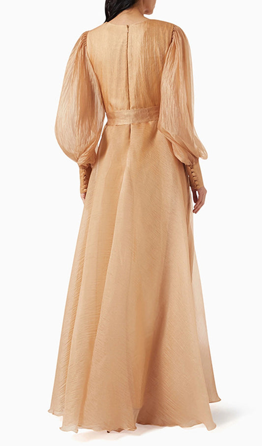 34% İndirimFener Kollu V Yaka Bel Kemerli Maksi Elbise
