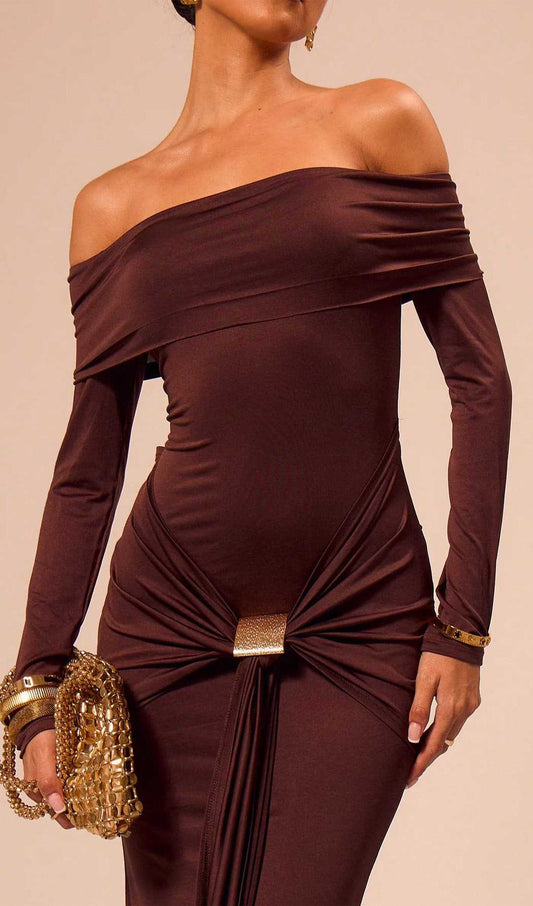 Kapalı Omuz Fırfırlı Maksi Elbise Kırmızımsı Kahverengi