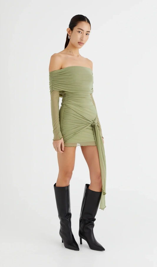 32% İndirimKapalı Omuz Şeffaf Fileli Mini Elbise-Yeşil