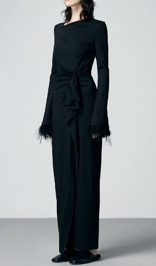27% İndirimTüy Manşetli Streç Krep Maksi Elbise