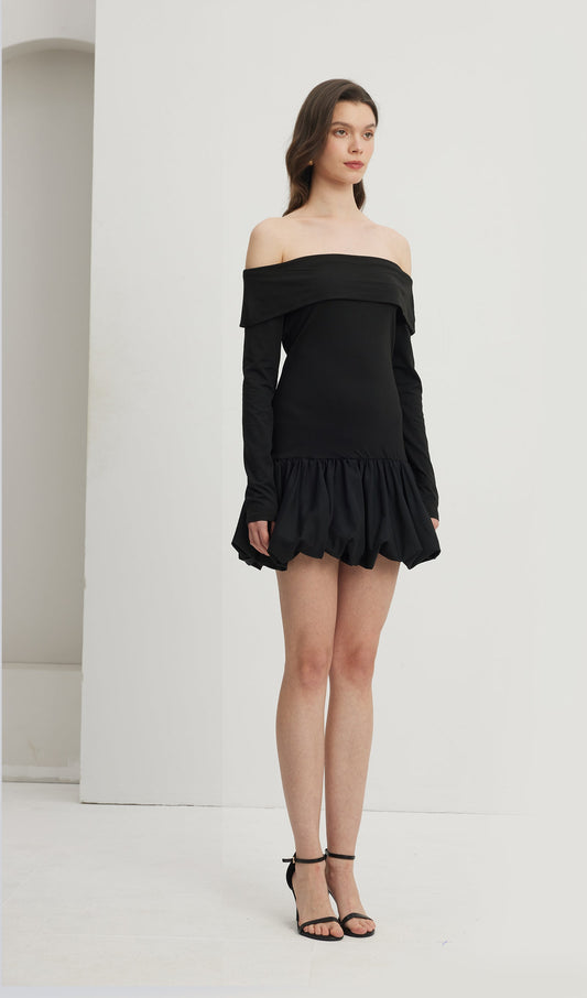 30% İndirimOmuzları Açık Balon Mini Elbise-Siyah