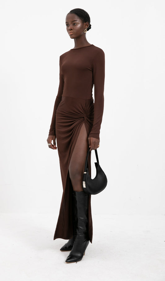 31% İndirimDrapeli Jersey Yırtmaçlı Maksi Elbise-Kahverengi