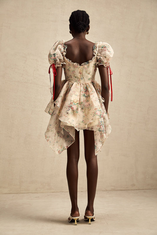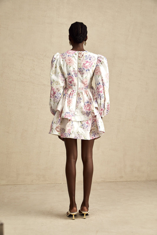 33% İndirimSaige Fırfırlı Çiçek Desenli Beyaz Mini Elbise