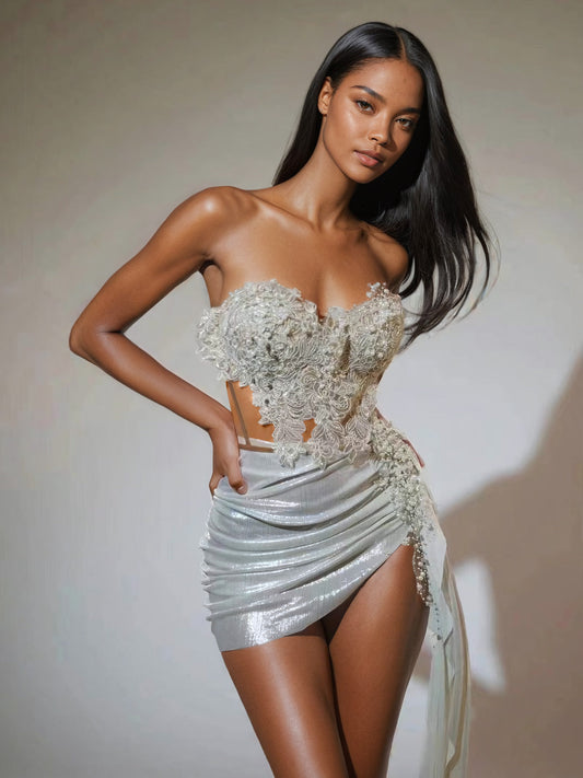 21% İndirimNyxara Straplez Payetli Gümüş Mini Elbise