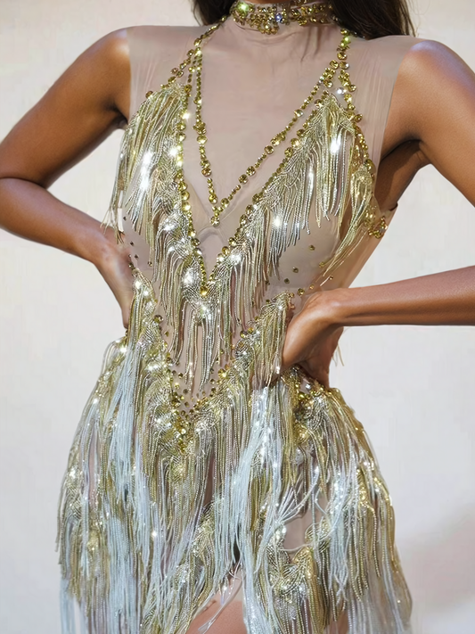 27% İndirimBuggan Rhinestone Saçaklı Örgü Mini Elbise Altın