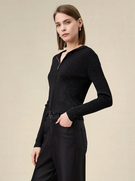 Amoretu Yün Altın Gümüş İplik Fermuarlı Kazak Ceket