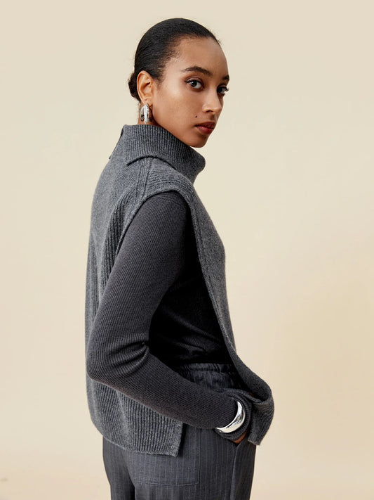 Örgü %100 Yünlü Kolsuz Yüksek Yaka Kazak Yelek Üstü