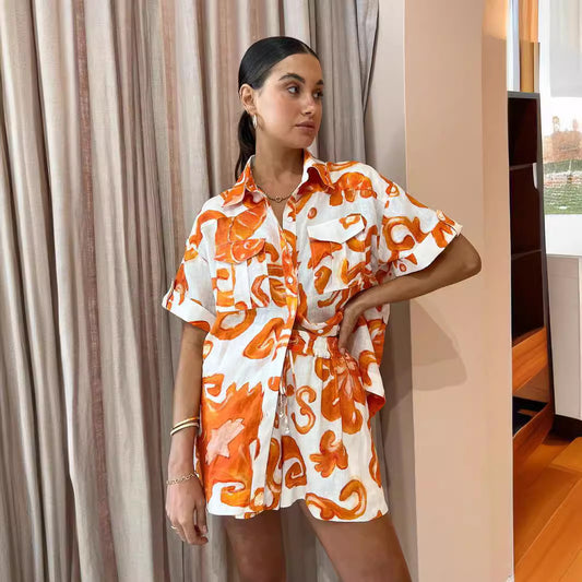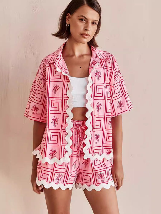 Tatil Stili Benzersiz Etnik Baskılı Gömlek Şort Takımı