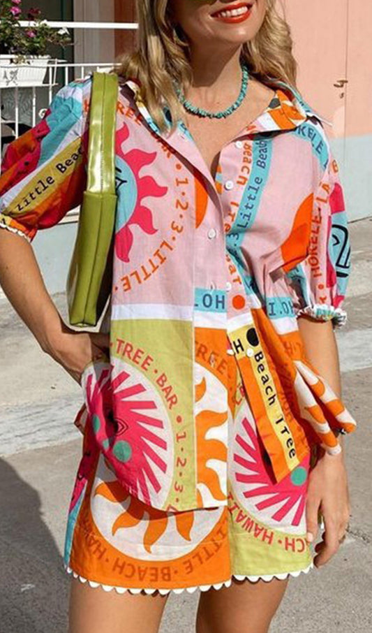 Parlak Güneş Bol Baskılı Tatil Gömlek Şort Takımı