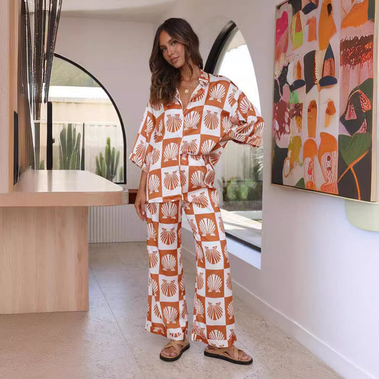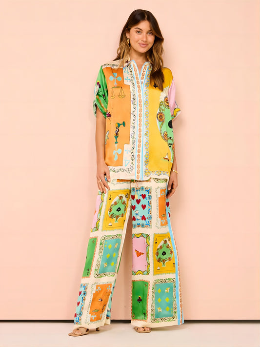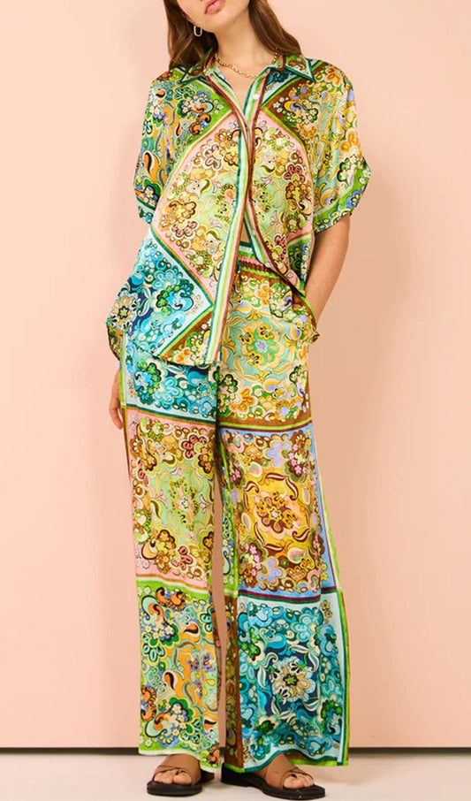 32% İndirimÖzel Saten Kabuk Baskılı Geniş Paça Pantolon-Set