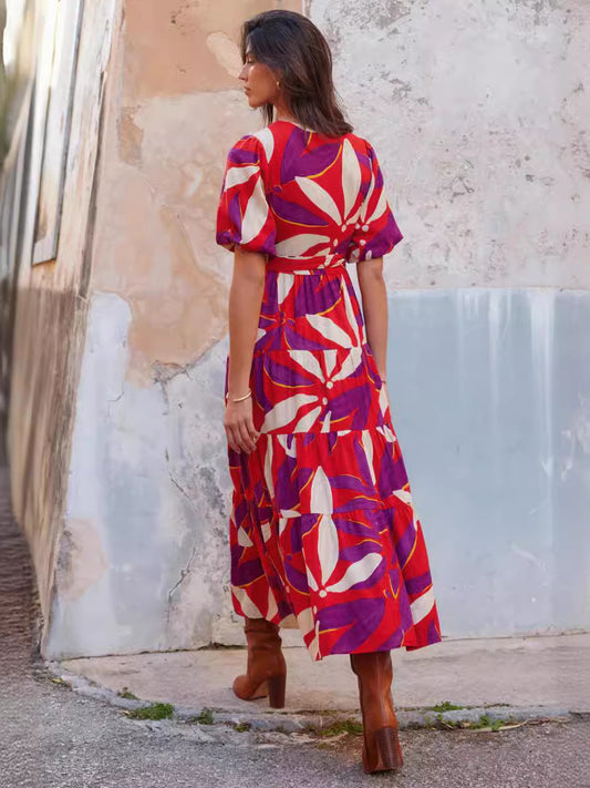 35% İndirimV Yaka Puf Kollu Yırtmaç Baskılı Maksi Elbise