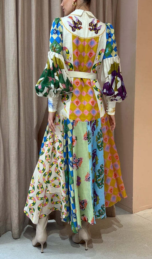 27% İndirimPatchwork Fener Kollu Kemer Gömlek Maksi Elbise