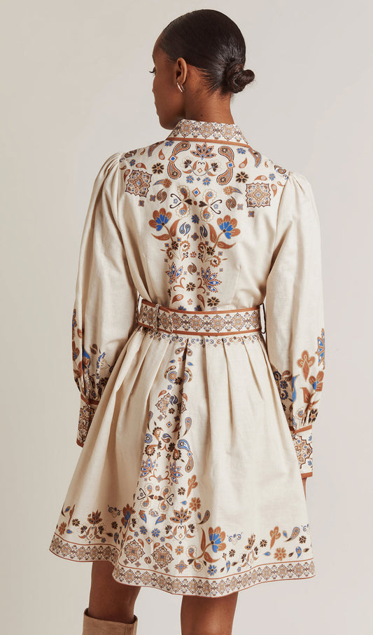 Çiçekli Düğme Aşağı Bel Kemerli A Line Mini Elbise
