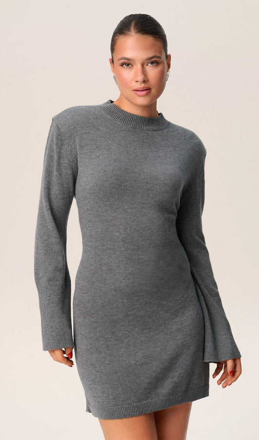 Nervürlü Uzun Kollu Dökümlü Mini Örgü Elbise - Gri