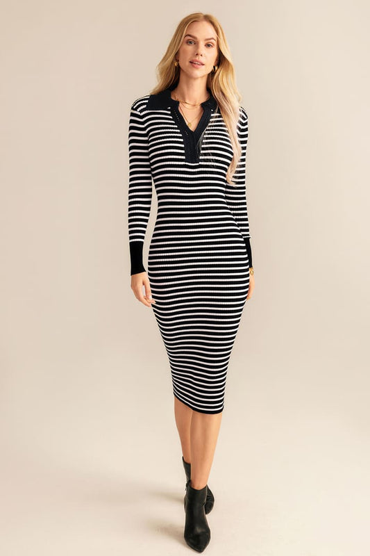 Gündelik V Yaka Örgü Çizgili Uzun Kollu Midi Elbise