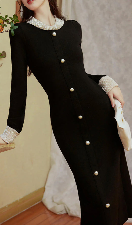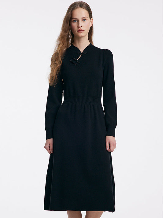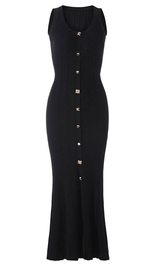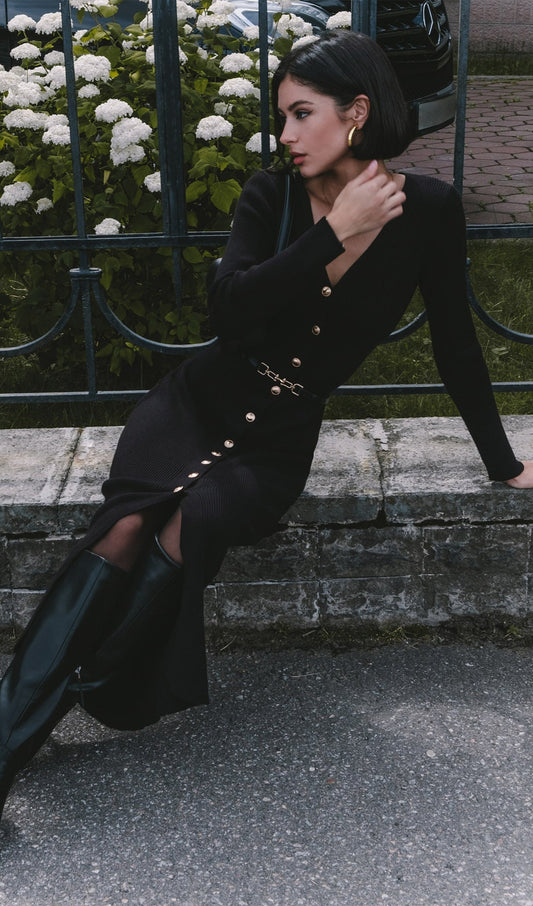23% İndirimMetalik Düğmeli Örgü Midi Elbise Siyah