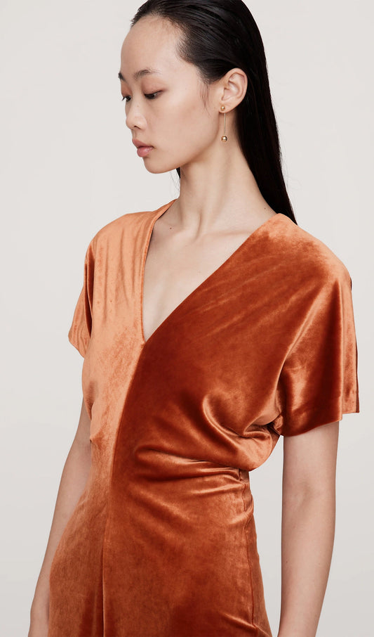 28% İndirimBiye Kesimli Kadife Maksi Elbise-Bakır