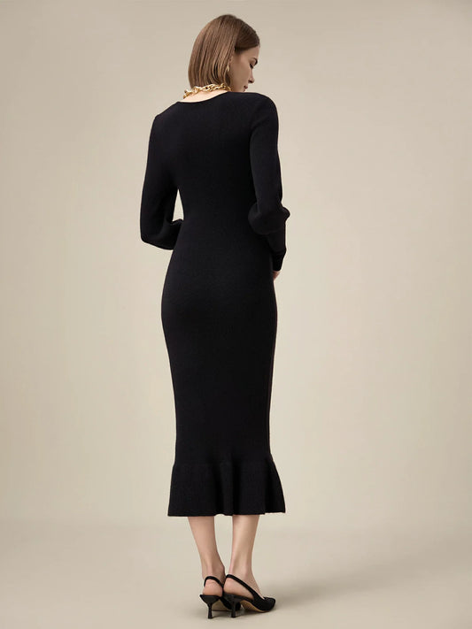 28% İndirimÖrme Fırfırlı Midi Elbise-Siyah