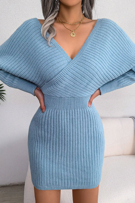 28% İndirimWrap V Yaka Ribana Örgü Mini Elbise - Mavi