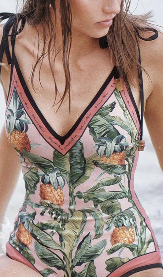 55% İndirimDerin V Yaka Yular Baskılı Tek Parça Mayo-Pareo