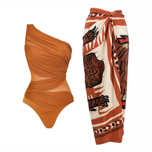 57% İndirimTek Omuz Fırfır Baskılı Tek Parça Mayo-Pareo