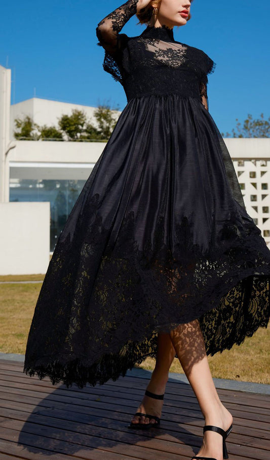 26% İndirimUzun Kollu Dantel Fit ve Flare Midi Elbise Siyah