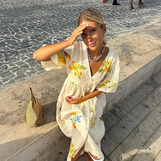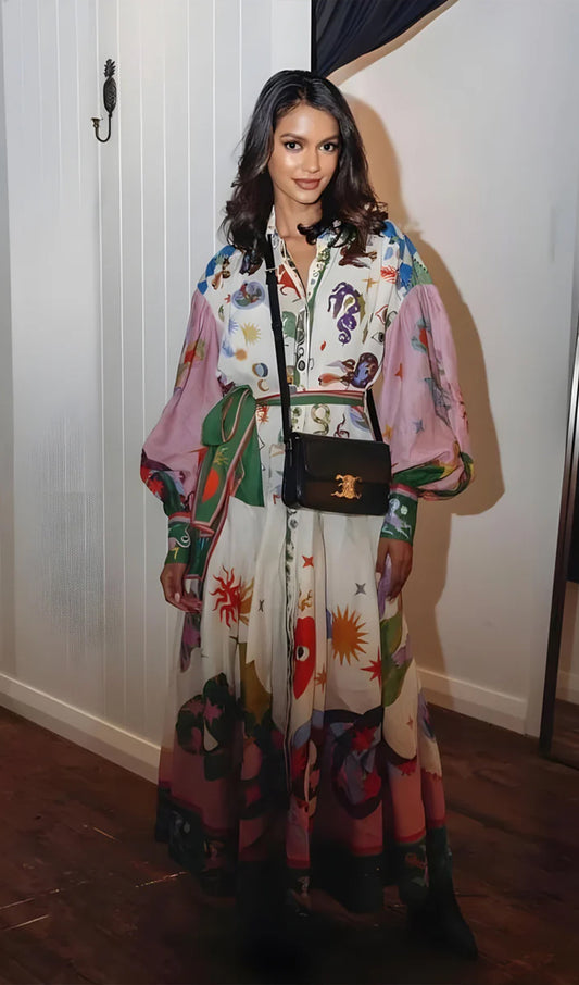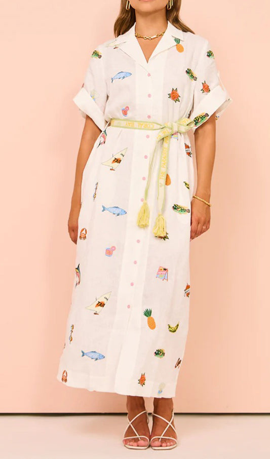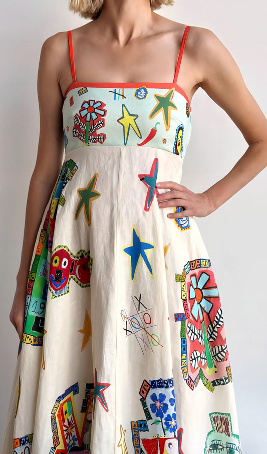 She's The Fun Keten Karışımlı Eğlenceli Baskılı Merdiven Kesimli Midi Elbise