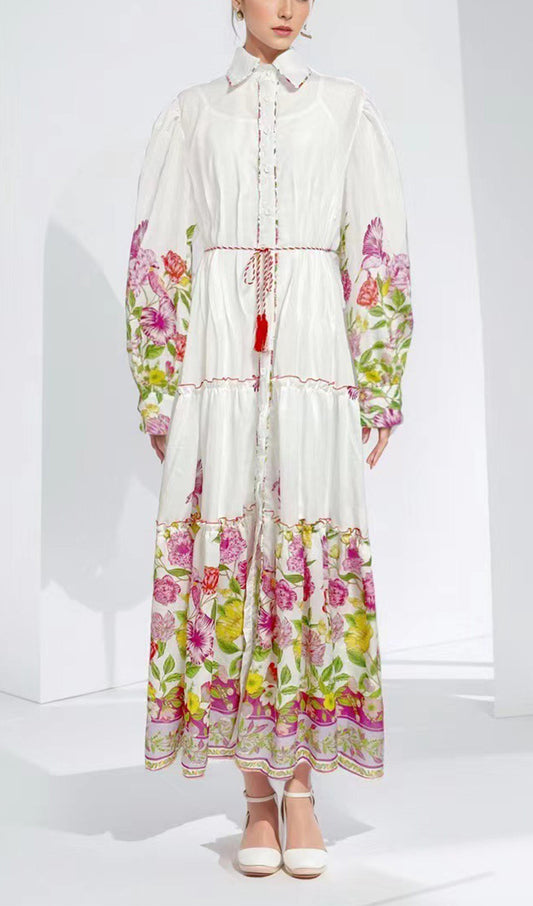 29% İndirimÇiçekli Fener Kollu Kemerli Gömlek Midi Elbise