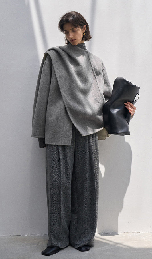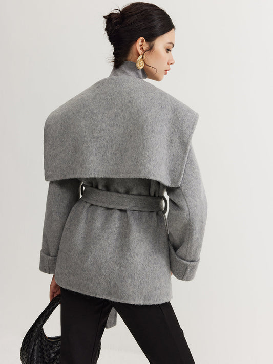 23% İndirimSolid Pelerin Stili %100 Yün Kaban-Gri