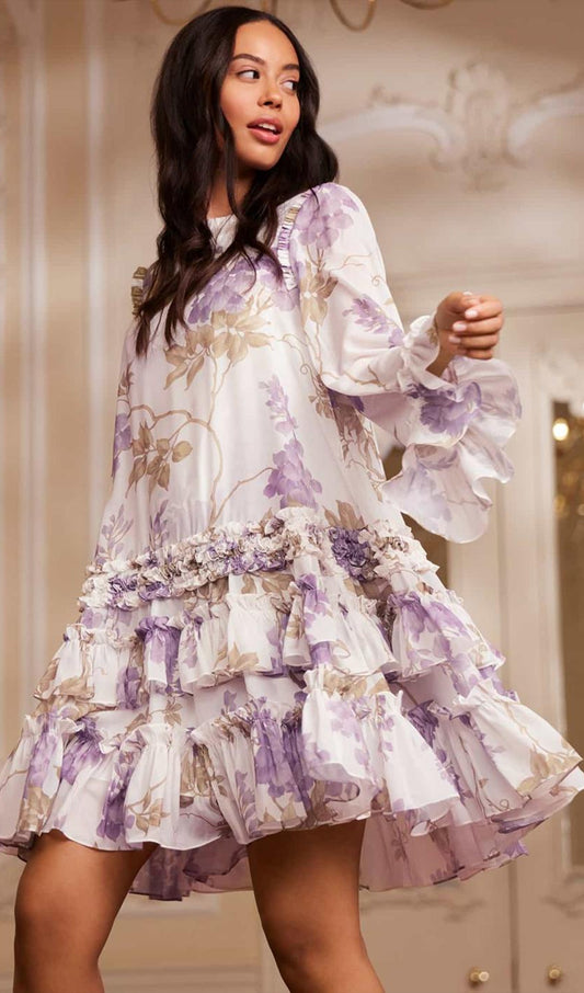 Uzun Kollu Çiçekli Fırfırlı Belden Bağlamalı Mini Elbise