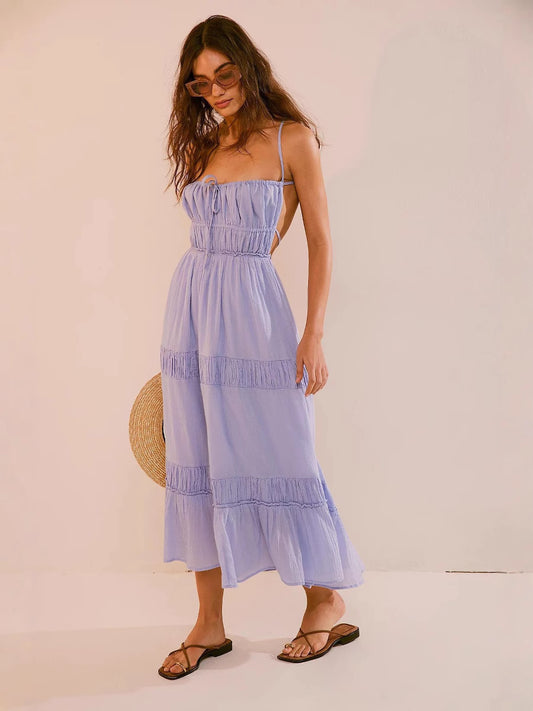 Sırtı Açık Büzgülü Katmanlı Fırfırlı Plaj Tatili Midi Elbise