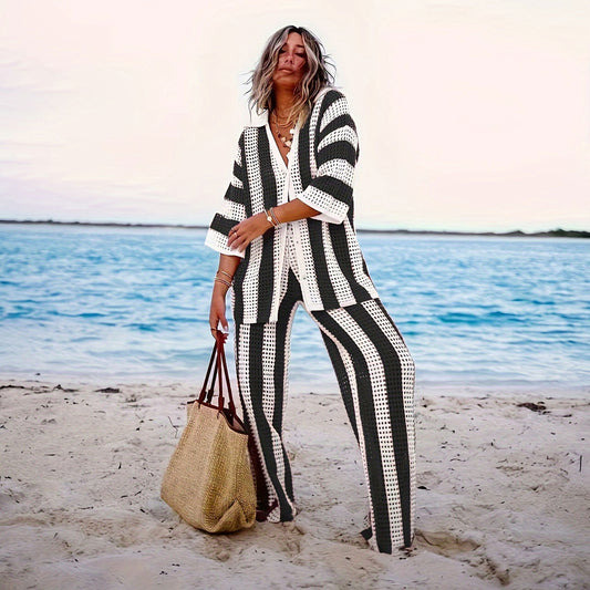 34% İndirimModa Bol V Yaka İçi Boş Çizgili Pareo