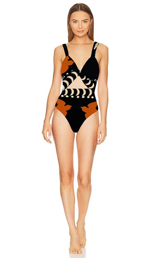 55% İndirimDerin V Yaka Yular Baskılı Tek Parça Mayo-Pareo