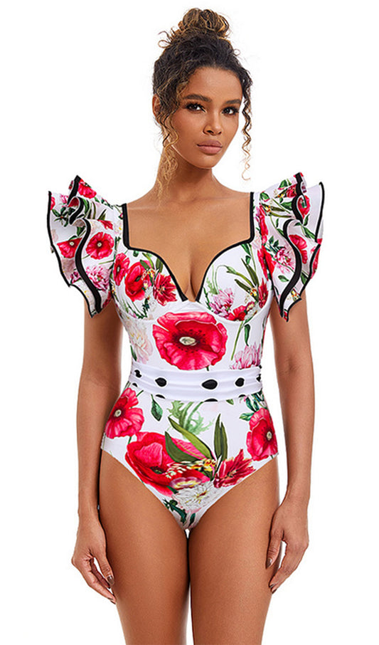Bandeau Fırfırlı Kırmızı Çiçek Silueti Mayo-Pareo