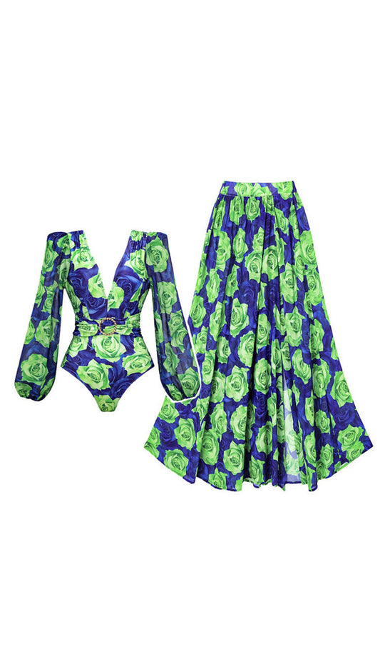 Şal Etekli Tek Parça Kırmızı Çiçekli Yeşil Mayo-Pareo