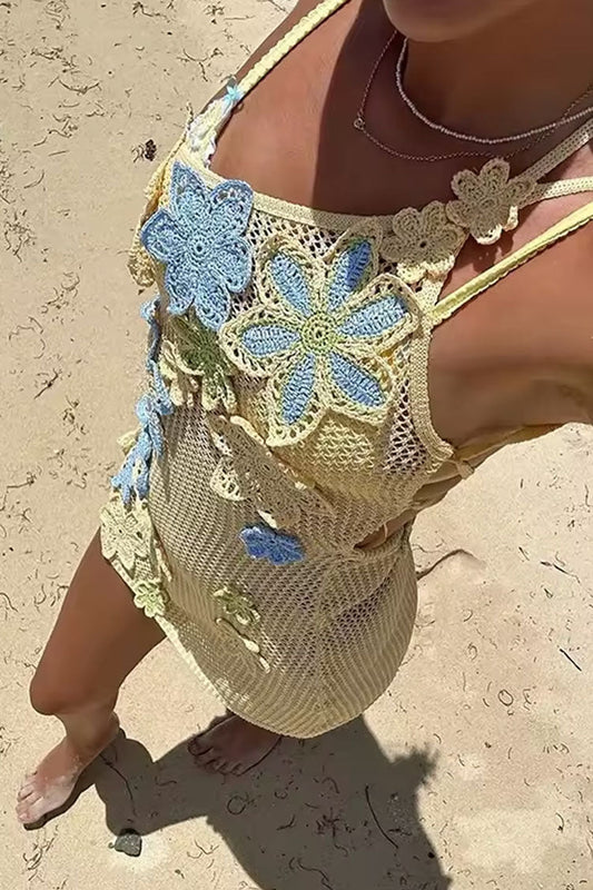 Boho Tek Omuz Bağcıklı Sırtı Açık Çiçekli Tığ Örgü Pareo