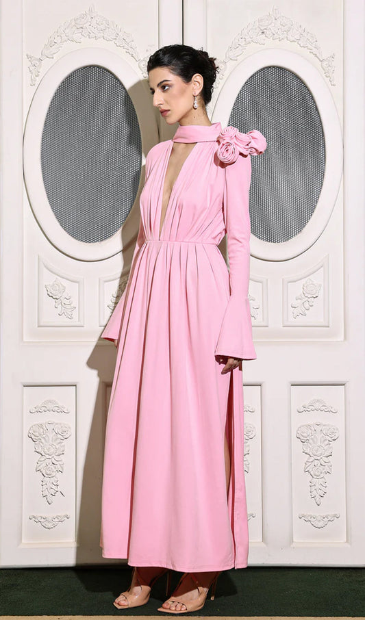 28% İndirimÇiçek V Yaka Pileli Yırtmaçlı Maksi Elbise-Pembe