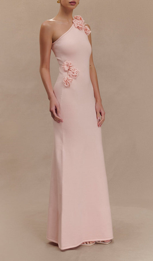 Tek Omuz Çiçekli Örgü Maksi Elbise - Bebek Pembesi