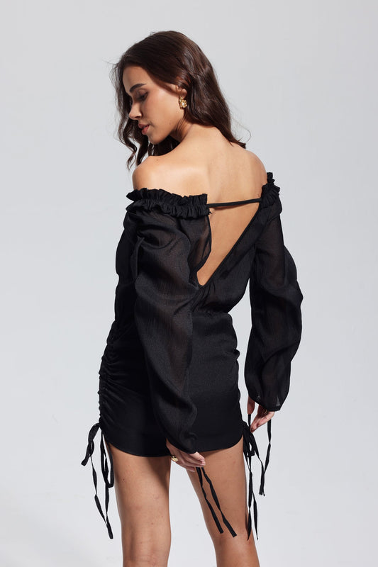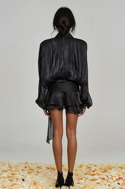 Aminah Balon Kollu Ruch Fırfırlı Mini Elbise Siyah