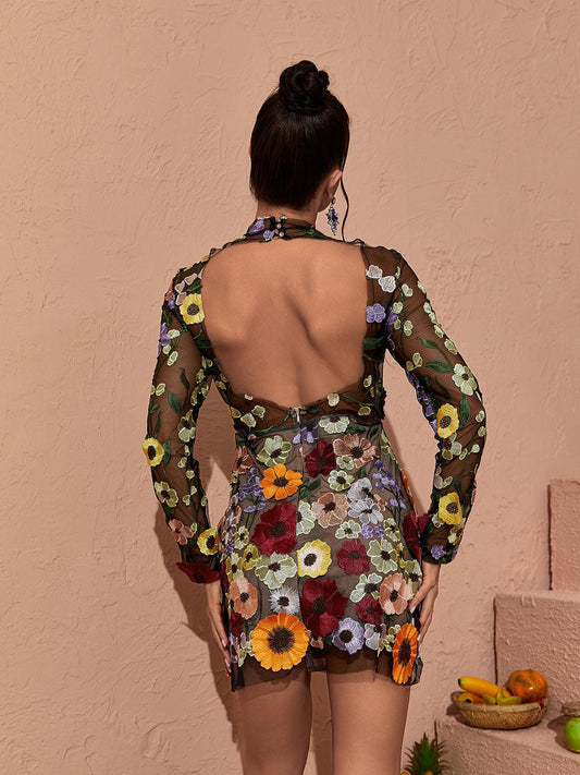 31% İndirimSaige Siyah Uzun Kollu File Çiçek Mini Elbise