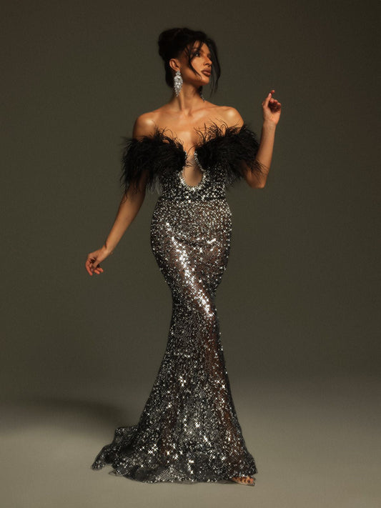 23% İndirimDaire Rhinestone Tüylü Denizkızı Maxi Elbise