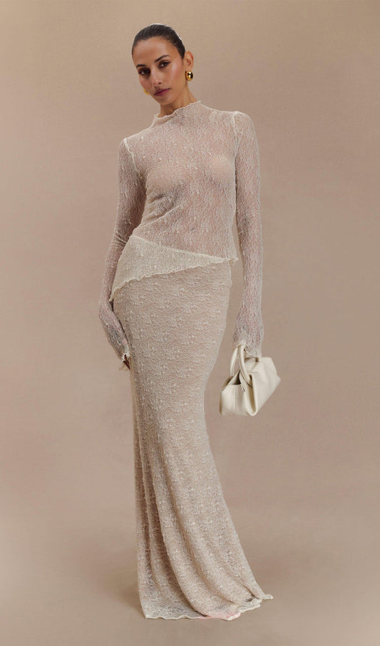 28% İndirimŞeffaf Dantel Uzun Kollu Üst - Fildişi