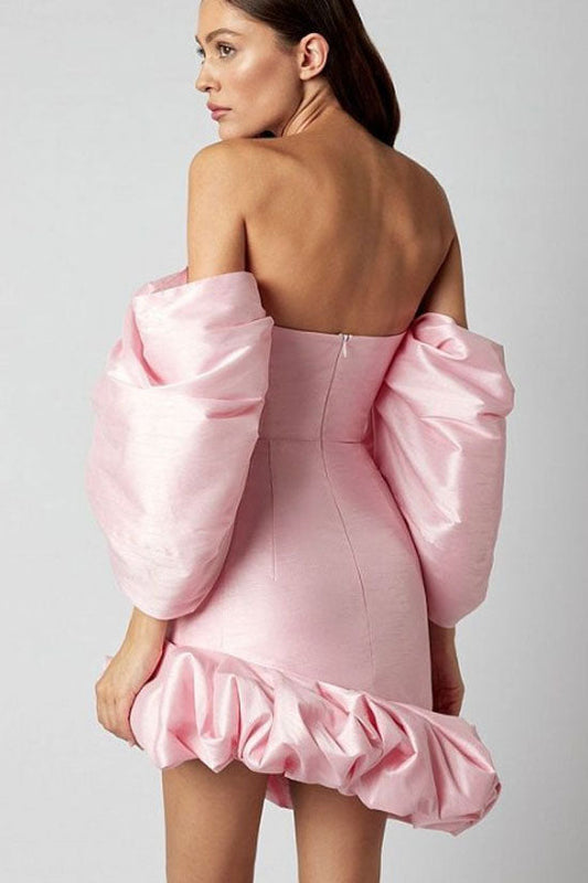 24% İndirimPuf Kol Fırfırlı Saten Parti Mini Elbise - Pembe