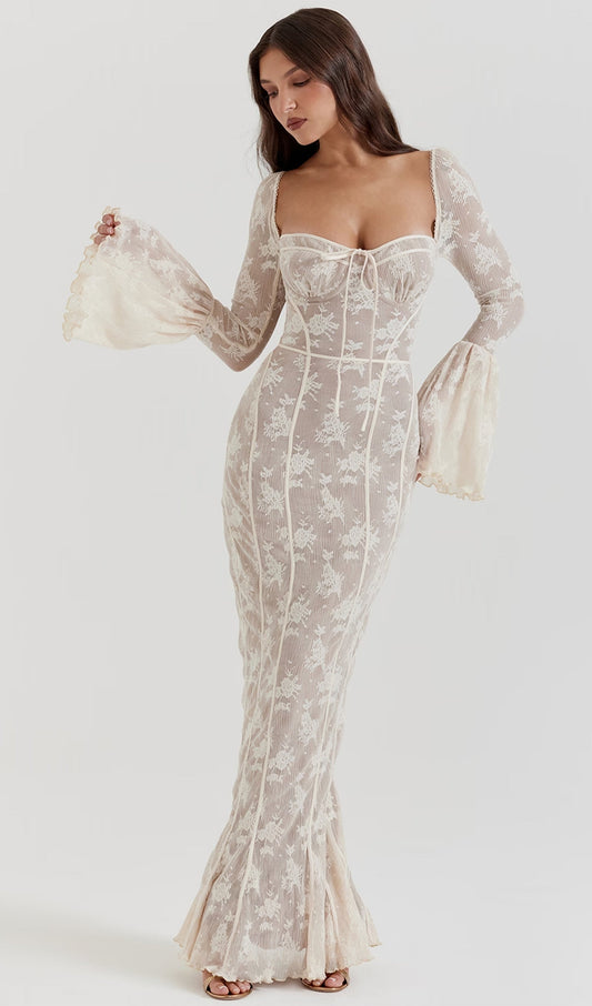 28% İndirimVintage Krem Dantel Maksi Elbise
